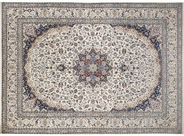 Feiner Nain-Teppich Persien. Wolle mit Seide auf Baumwolle. Im elfenbeinfarbenen Innenfeld großes dunkelgrundiges Zentralmedaillon mit Anhängern sowie breite entsprechende Ecklösungen. Flächendeckend dichte Musterung aus üppigem Rankenwerk. Umlaufend breite Bordüre aus eingerollten Blattvoluten flankiert von korrespondierenden Nebenbordüren. 254 cm x 356 cm.