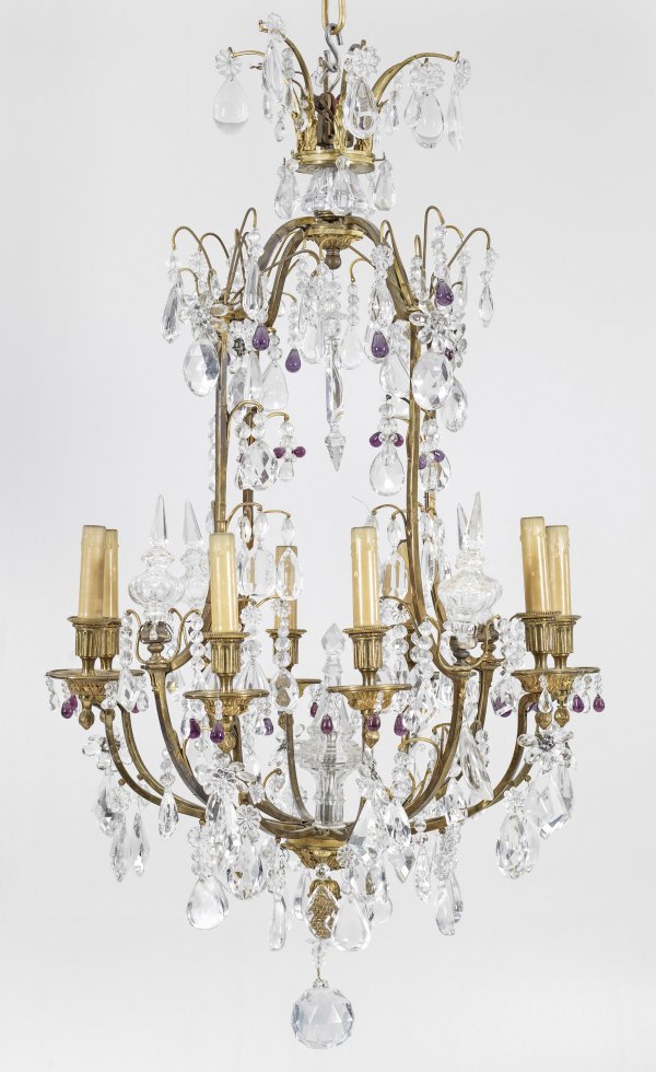 Großer Deckenlüster 8-flg.; Bronze, vergoldet sowie farbloses und amethystfarbenes Kristallglas. Offen gestalteter, balusterförmiger Korpus aus stark geschwungenen Streben mit Dekorationen aus großen Glasbalustern. Korrespondierende Leuchterarme mit kannelierten, vasenförmigen Tüllen über Traufschalen. Balusterförmiger oberer Abschluss sowie Bekrönung aus gebogten Streben. Reicher Behang aus unterschiedlichen Tropfen und facettierten Prismen. Elektrifiziert. H. 110 cm. D. 62 cm.