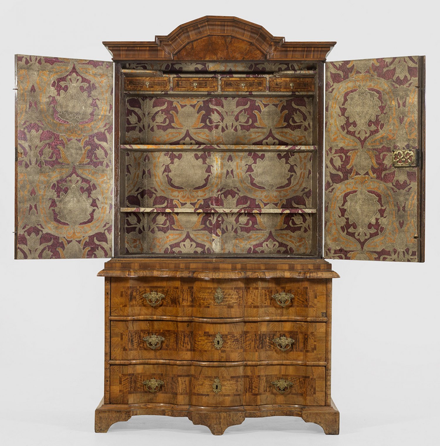 Große Barock-Aufsatzkommode Nussbaum und Nussbaummaser furniert sowie Einlagen aus Pflaumenholz. Gerader Korpus auf gekehlter Profilzarge sowie gesägten Füßen. In der gegliederten Front drei breite mehrfach gegenläufig geschweifte Schubladen. Korrespondierende profilierte Deckplatte. Oberhalb zurückgesetzter zweitüriger Aufsatz mit gekehltem mittig aufgeworfenem Kranzgesims. Innen Ablageflächen und kleine Schubfächer sowie Tapetenauskleidung mit reichem Brokatmuster in Violett Orange und Silber. Flächendeckend breit gerahmte Furnierfelder von teilw. mäanderförmig verkröpften Bandeinlagen begrenzt sowie in den Türen zentriert angeordnete Kartuschenmotive. H. 212 cm. 122 cm x 62 cm.