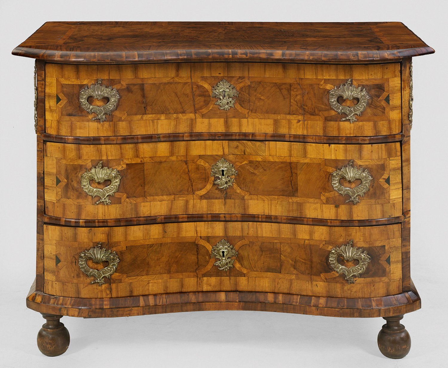 Barock-Kommode Nussbaum furniert. Gerader rechteckiger Korpus auf schmaler Profilzarge und Kugelfüßen. In der gegliederten Front drei breite doppelt geschweifte Schubladen. Korrespondierende weit überstehende Deckplatte. Flächendeckend breit gerahmte Furnierfelder von teilw. verschlungenen Bandeinlagen begrenzt. H. 85 cm. 114 cm x 62 cm.