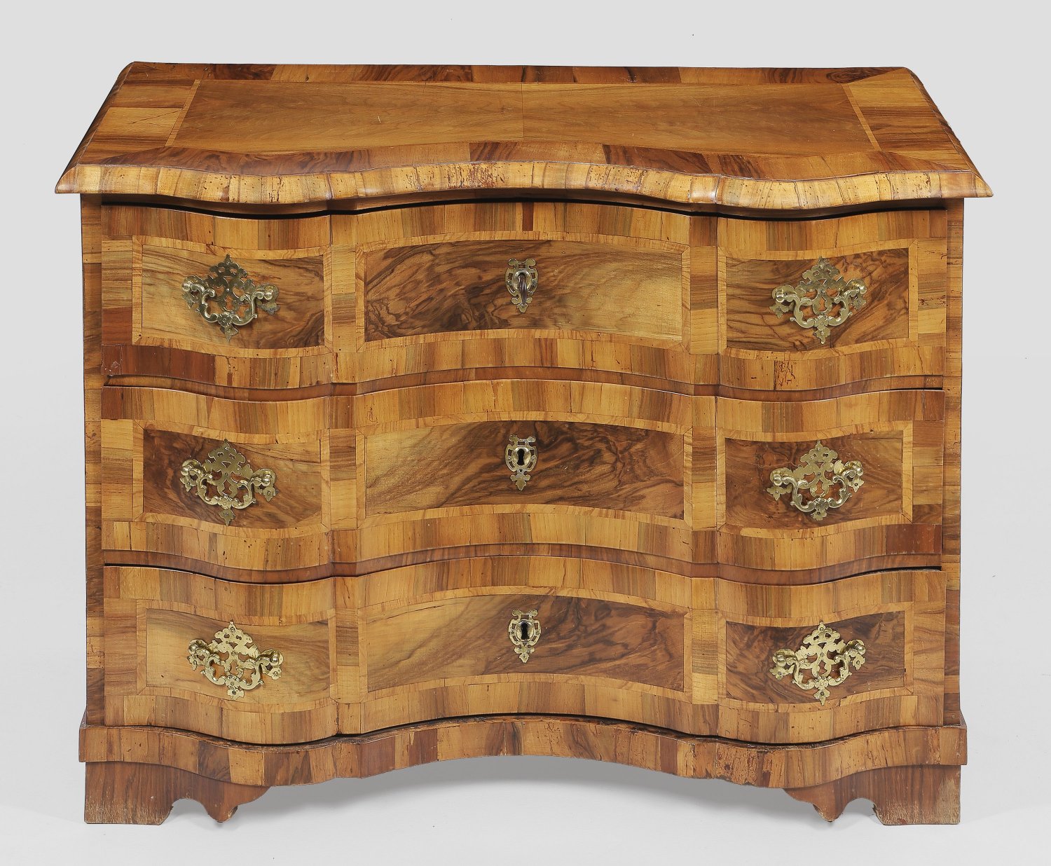 Barock-Kommode Helles Nussbaum furniert. Gerader rechteckiger Korpus auf schmaler Zarge und gesägten Füßen. In der gegliederten Front drei breite gegenläufig geschweifte Schubladen. Gering überstehende Deckplatte. Flächendeckende Furnierfelder von Bandeinlagen begrenzt. H. 79 cm. 108 cm x 59 cm.