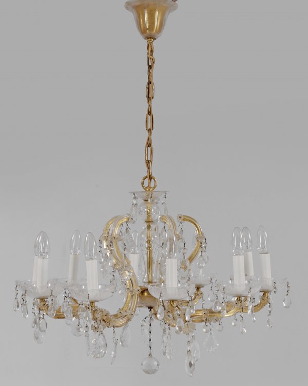 Maria Theresia-Deckenlüster 10-flg.; Farbloses Glas und goldfarbenes Metall. Stark geschwungene Streben als Träger für Leuchtmittel in Form von zylinderförmigen Tüllen über großen Traufschalen. Reicher Behang aus facettierten Prismen. Lange Kettenaufhängung. Elektrifiziert. Teilw. besch.; Lampen-H. 47 cm. D. 70 cm. Ges.-H. 100 cm.