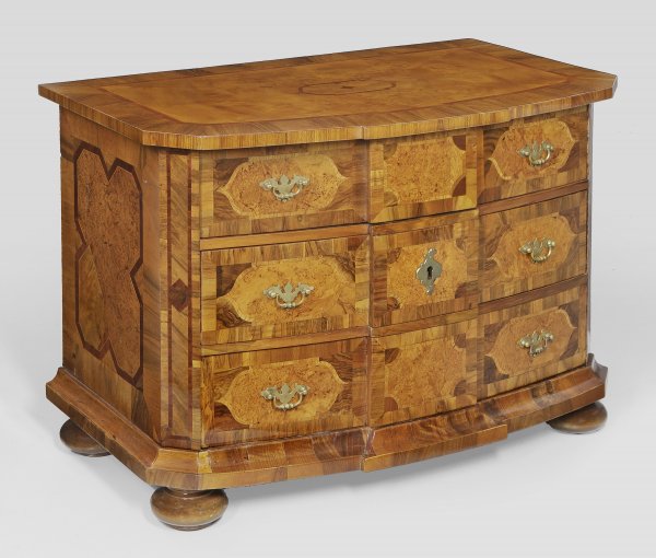 Barock-Kommode Nussbaum und Nussbaummaser furniert sowie Einlagen aus Eschenholz. Gerader querrechteckig angelegter Korpus flankiert von schräggestellten Ecklisenen auf gekehlter Zarge und gedrückten Kugelfüßen. In der gegliederten Front drei breite bombierte Schubladen mit flachem Mittelrisalit. Weit überstehende Deckplatte. Flächendeckend breit gerahmte teilw. kartuschenförmige Furnierfelder von Bandeinlagen begrenzt. H. 75 cm. 106 cm x 65 cm.