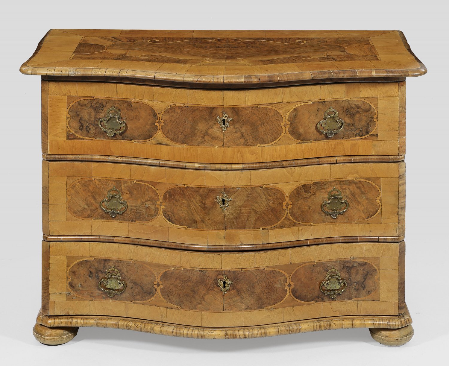 Barock-Kommode Nussbaum furniert. Gerader querrechteckig angelegter Korpus auf gerundeter Zarge und gedrückten Füßen. In der gegliederten Front drei geschweifte Schubladen. Weit überstehende Deckplatte. Flächendeckend breit gerahmte Furnierfelder von Bandeinlagen begrenzt. H. 85 cm. 116 cm x 64 cm.