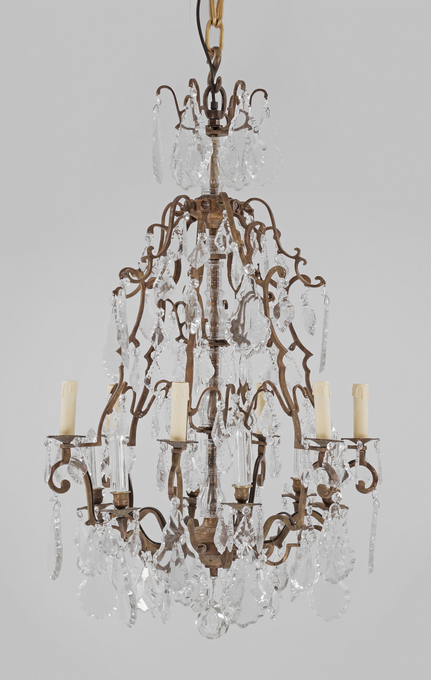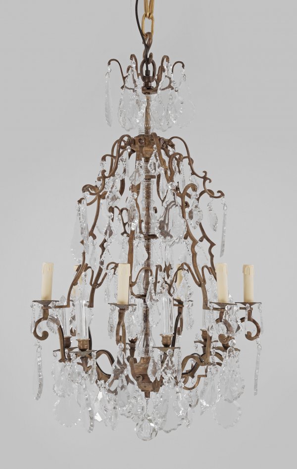 Deckenlüster 6-flg.; Bronze, dunkel patiniert und farbloses Glas. Balusterförmiger Korpus aus stark geschwungenen Voluten als Träger für Leuchtmittel mit zylinderförmigen Tüllen im Wechsel mit gekanteten Dekorationen. In der Mitte mehrfach gegliederter Balusterschaft. Reicher Behang aus großen, facettierten Prismen. Elektrifiziert. H. 100 cm. D. 60 cm.