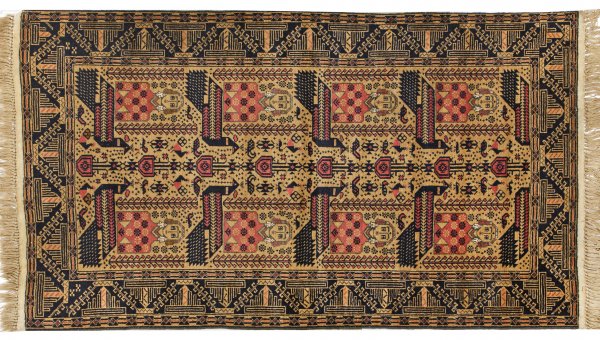 Belutsch-Brücke Ostpersien. Wolle auf Wolle. Im beigefarbenen Innenfeld flächendeckende Musterung aus Büsten und großen Pfauen. Umlaufend breite dunkelgrundige Bordüre aus hakenbesetzten Streben und Ornamentbändern. 113 cm x 200 cm.