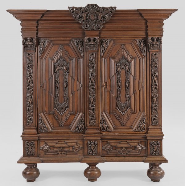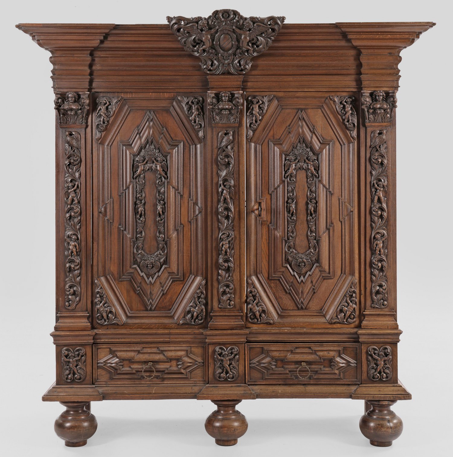 Großer Barock-Dielenschrank Eichenholz. Gerader hochrechteckiger Korpus flankiert von breiten Lisenen mit erhaben reliefiertem Blattwerk Putten und Vögeln auf korrespondierendem zweischübigem Zargensockel und hohen Kugelfüßen. In der gegliederten Front zwei große Türen mit erhaben reliefierten Profilfüllungen. Stark vorkragendes Profilgesims mit Bekrönung aus großer Blattkartusche. H. 214 cm. 211 cm x 73 cm.