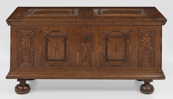Große Flachdeckeltruhe Eichenholz. Gerader, querrechteckig angelegter Korpus mit seitlichen Griffen auf gekehlter Zarge und hohen Kugelfüßen. In der Front und auf den Seiten profilierte Reserven mit eingelegten Faltsternen und Blüten. Bez. "Anna (...) Betz dorff Anno 1782". Flacher Deckel sowie innen sog. Hohe Kante mit Geheimfach. H. 75 cm. 157 cm x 65 cm.