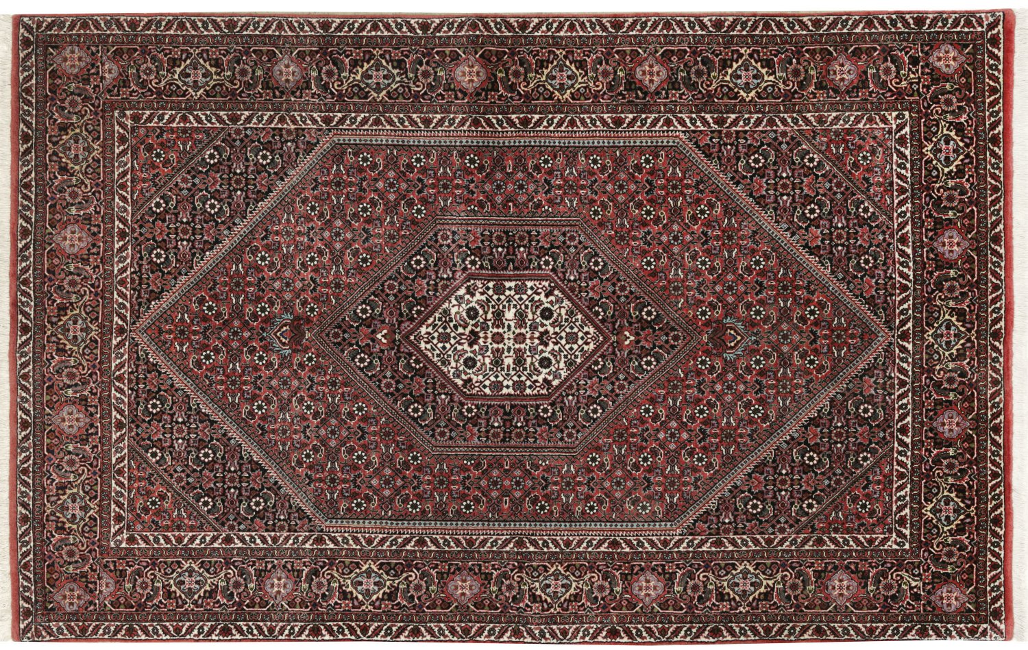 Bidjar-Brücke Persien. Wolle auf Baumwolle. Feine Knüpfung. Im roten Innenfeld großes dunkel- bzw. beigegrundiges Rautenfeld und breite Ecklösungen. Flächendeckend dichte Herati-Musterung aus Rautenmotiven und Rosetten. Umlaufend breite Hauptbordüre aus Palmettenranken flankiert von schmalen Bändern. 132 cm x 215 cm.
