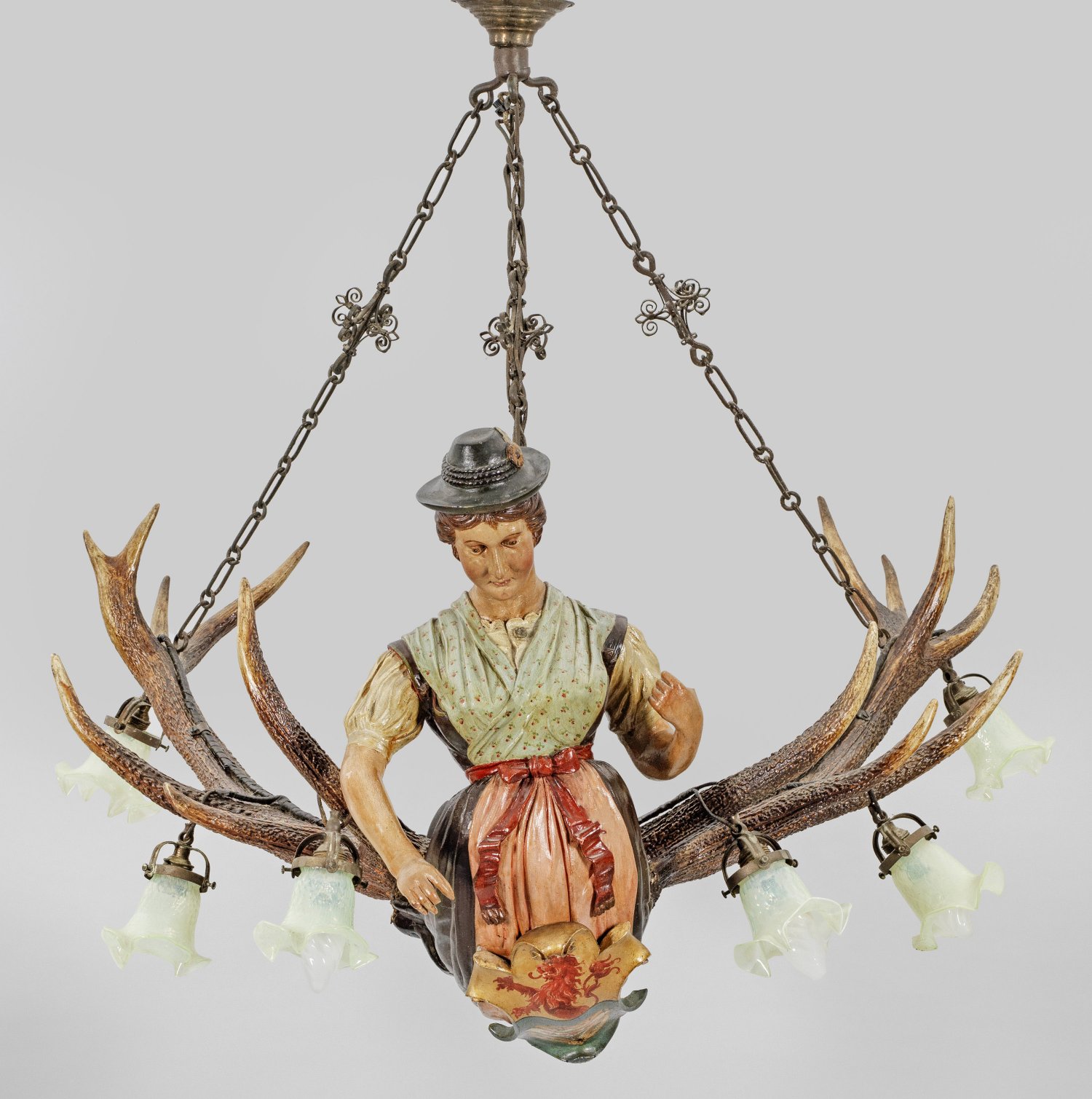 Lüsterweibchen 6-flg.; Holz, geschnitzt und polychrom gefasst. Vollplastische Darstellung einer jungen Frau in Tracht mit großer Wappenkartusche. Davon ausgehend 6- bzw. 7-endige Geweihstangen als Träger für Leuchtmittel mit kelchförmigen Schirmen. Auf dem Rücken weitere Lampenfassung. Kettenaufhängung. Elektrifiziert. H. 83 cm. 92 cm x 82 cm.