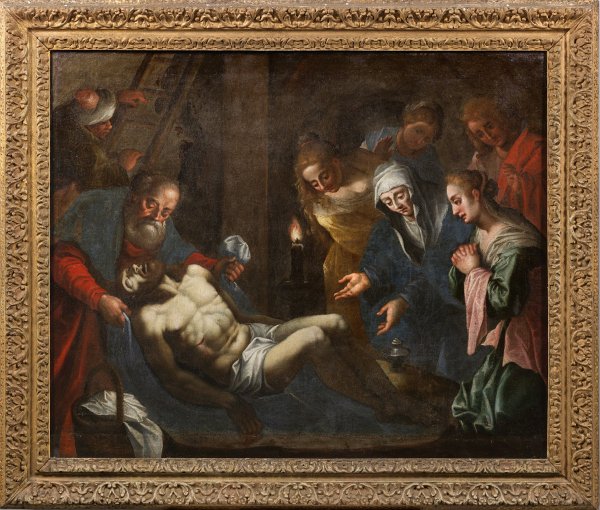 Nächtliche Szene im Kerzenschein. Der von Joseph von Arimathäa und Nikodemus vom Kreuz abgenommene Christus wird von einer Mariengruppe und Johannes beweint. Großformatiges Barock-Gemälde eines niederländisch-flämischen Meisters, dessen effektvolle Lichtführung den Einfluss der Caravaggisten widerspiegelt. Öl/Lwd.; 89 cm x 109 cm. Originalrahmen.