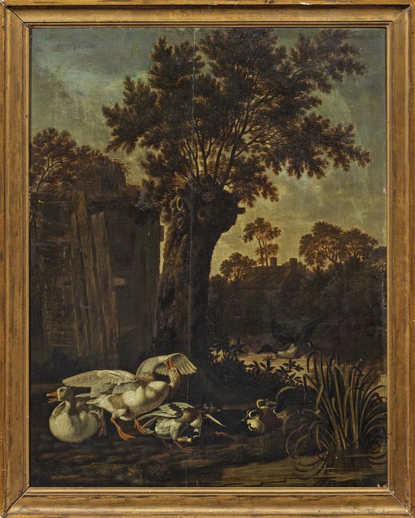 Lebendig geschilderte Gruppe aus weißen Enten und Stockenten vor einem verfallenden Bretterhäuschen und einer Kopfweide am Ufer, im Hintergrund ein Gehöft. In Motiv und Stil charakteristisches Werk Wijntracks, der durch seine Landschaften und Bauernhofszenen mit Tieren - insbesondere Enten - bekannt ist. Gemälde Wijntracks befinden sich u. a. in der Eremitage in St. Petersburg, im Rijksmuseum in Amsterdam sowie in Museen in Aachen, Den Haag und Utrecht. Öl/Eichenholztafel. Verso altes Etikett des 19 Jhs. mit Attributierung sowie ein weiteres Etikett mit Provenienzangaben. 72 cm x 57 cm. Rahmen.