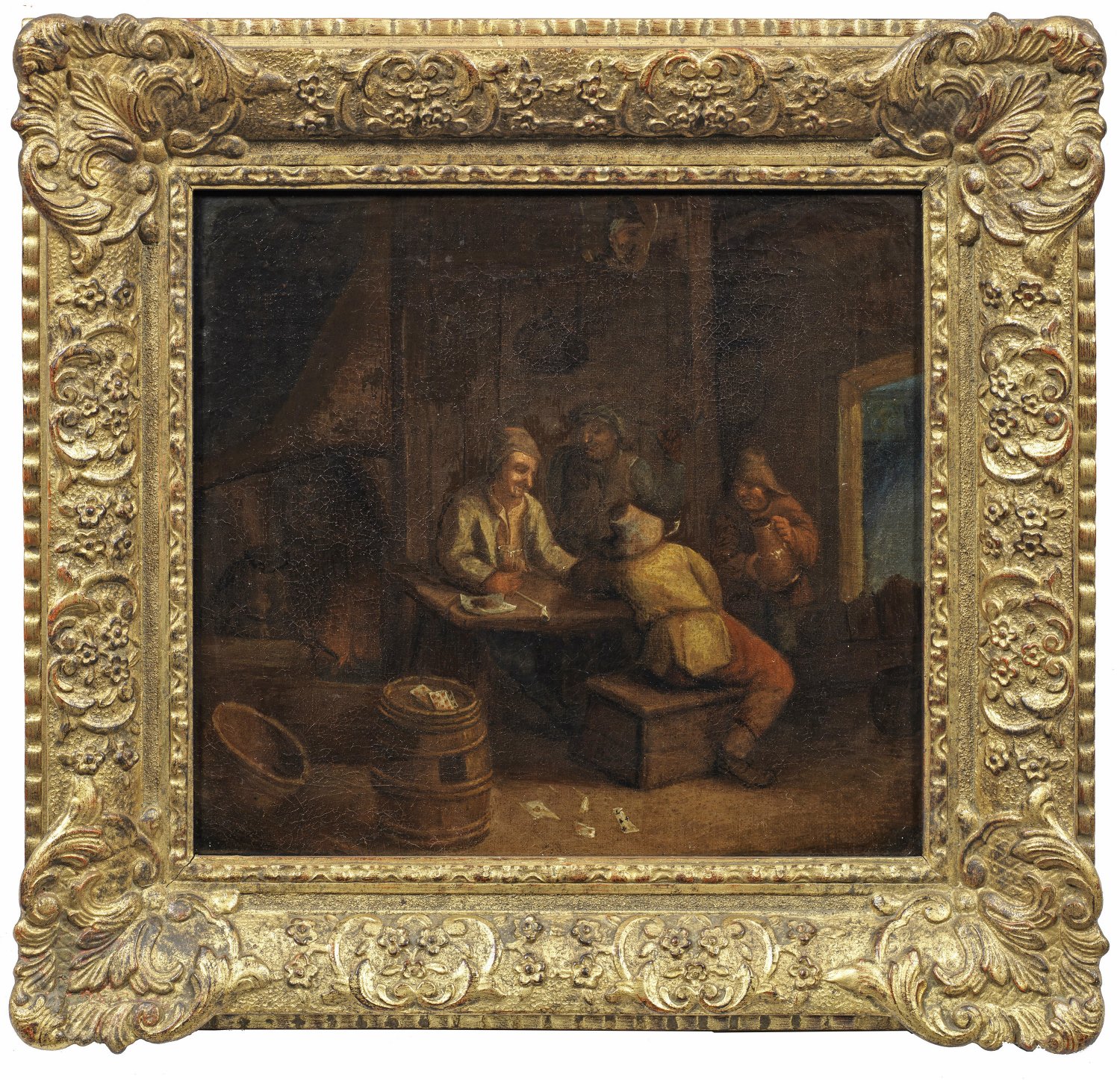 Ländliches Wirtshausinterieur mit zechenden und Karten spielenden Bauern