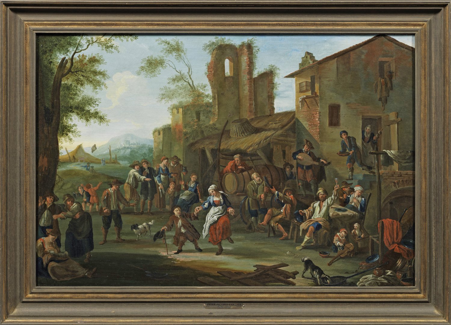 In Motiv, Stil und Kolorit für Miels "Bambocciade"-Gemälde typisches Werk mit einer lebensnah geschilderten, vielfigurigen Volksfestszene vor einer Architekturstaffage. Erzählerisch schildert Miel ausgelassene Tänzer, zechende und musizierende Figuren. Miel, der seine künstlerische Ausbildung wohl in Antwerpen erhielt, war 1633/36-1658 in Rom ansässig, wo er Mitglied der "Bentvueghels" war. Zugleich gehörte er zum Kreis der sog. von Pieter van Laer beeinflussten Genremaler der sog. "Bamboccianti", die mit Vorliebe Szenen schilderten, welche die einfache Bevölkerung in Rom und in der ländlichen Umgebung schilderten. Miel wurde zu einer bedeutenden Kraft im Zuge der Entwicklung dieser neuen Tradition in Rom und erwarb sich auch allgemein großes Ansehen. 1648 nahm man Miel als ersten nordischen Künstler in die angesehene Vereinigung Accademia di San Luca auf, 1650 in die Congregazione dei Virtuosi al Pantheon. 1658 berief ihn Karl Emanuel II. Herzog von Savoyen an den Hof nach Turin. Werke Miels befinden sich u. a. in der Eremitage, im Louvre und im Prado. Öl/Lwd., doubl.; 57 cm x 85 cm. Rahmen.