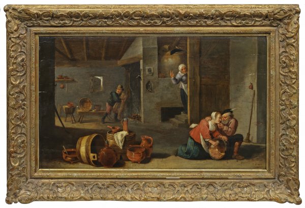 Szenische Darstellung in einem Interieur. Auf der rechten Bildseite im Vordergrund die kniende Küchenmagd beim Putzen eines Kessels, die zudringlich von einem alten Mann umarmt wird. Dahinter seine auf einer Treppe stehende, überraschend hinzutretende Frau, die über den ertappten Mann den mahnenden Zeigefinger hebt. Die linke Bildseite wird von einem stilllebenartigen Ensemble aus allerlei Hausgeräten dominiert, während ein junger Mann im Hintergrund ein Kaminfeuer mit Reisig und Holz anheizt. Motiv, Komposition und Figuren des in fein lasierender Malerei ausgeführten, künstlerisch qualitätvollen Gemäldes lassen sich mit mehreren Werken von Teniers vergleichen. Dieser malte eine Reihe von Versionen mit diesem zugleich humorvollen und moralisierenden Thema, die sich u. a. im Prado in Madrid (1630er Jahre; Inv.-Nr. 1800), im Kunsthistorischen Museum in Wien (dat. 1672; Inv.-Nr. GG 720), in der National Gallery in London (um 1650; Inv.-Nr. NG862) und in der Gemäldegalerie Alte Meister der Staatl. Kunstsammlungen in Dresden befinden. Öl/Eichenholztafel, parkettiert. R. u. monogr. "CO. MHV". 40,5 cm x 70 cm. Rahmen.