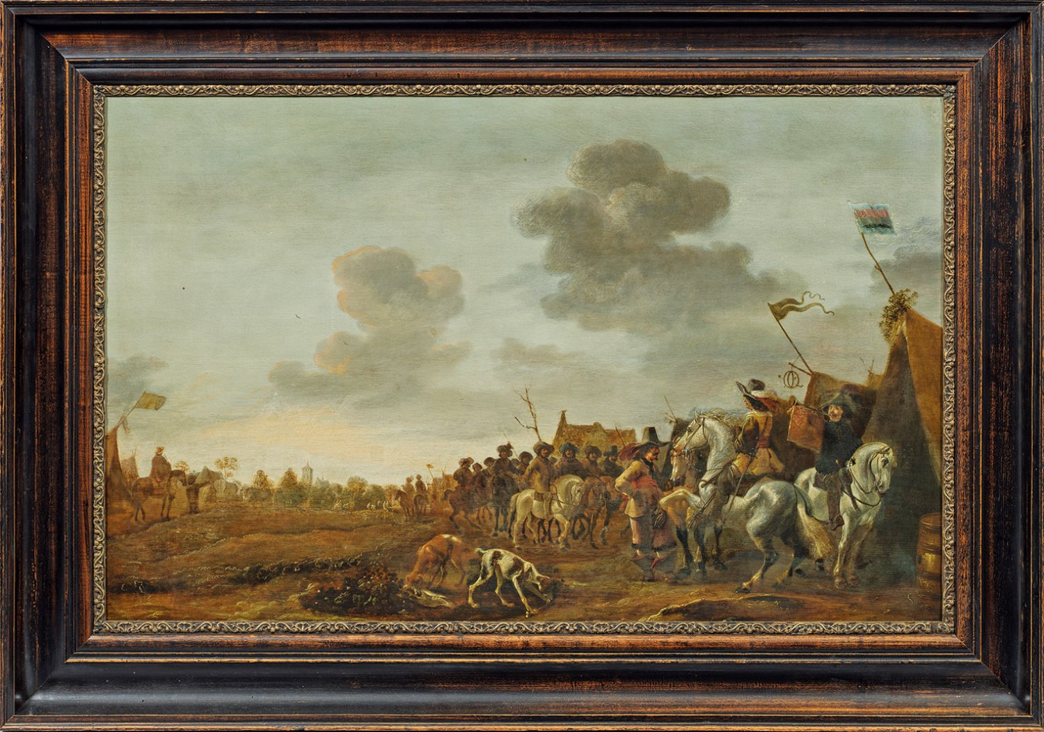 Vielfigurige Szenerie vor Marketenderzelten mit unterschiedlichen Reitern, Offizieren und einem Trompeter, im Vordergrund zwei Hunde, die sich an den Resten eines Pferdes delektieren. Das fein lasierend ausgeführte Tafelbild weist in Motiv, Komposition und Stil eine Reihe evidenter Parallelen zu gesicherten Gemälden des Künstlers auf, so dass eine Zuordnung in dessen Oeuvre plausibel ist. Palamedes Palamedesz lernte bei seinem älteren Bruder Anthonie Palamedesz und wurde durch Esaias van de Velde beeinflusst, mit dem er auch zusammenarbeitete. Ab 1627 Mitglied in der Lukasgilde in Delft, spezialisierte er sich in den 1630er Jahren auf Reiter-, Soldaten- und Gefechtszenen. Werke von ihm befinden sich u. a. in der Alten Pinakothek in München und im Heeresgeschichtlichen Museum in Wien. Öl/Eichenholztafel. 56 cm x 87 cm. Rahmen.