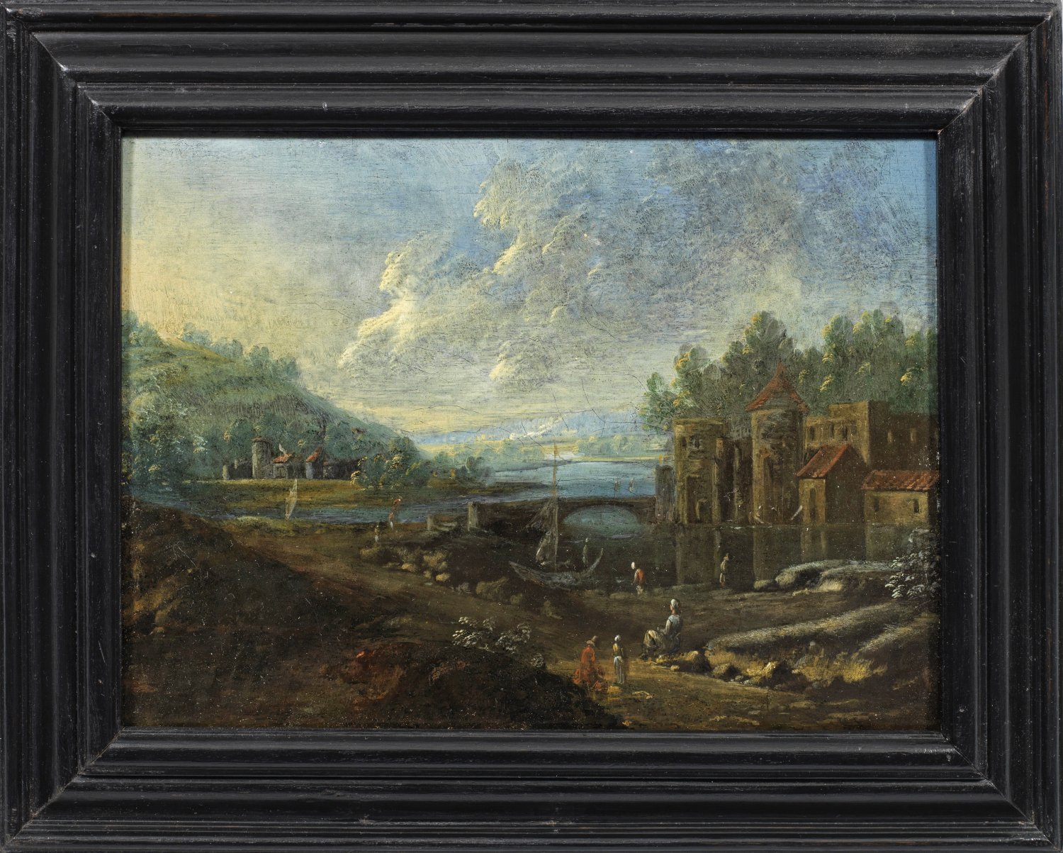 Durch kleinfigurige Staffage belebte, poetische Landschaftsszenerie, die durch Licht- und Farbspektive eine tiefenräumliche Wirkung entfaltet. Öl/Eichenholztafel. Verso altes, rotes Wachssiegel mit Kardinalswappen(?). 16,5 cm x 22,8 cm.