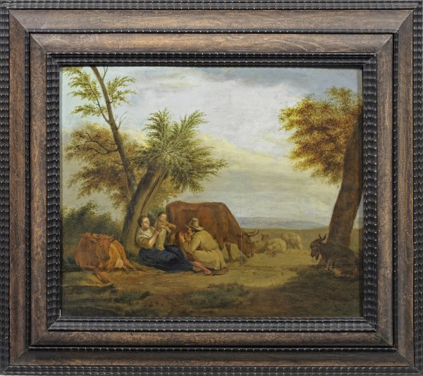 Fein lasierend gemalte Darstellung in der Tradition von Nicolaes Berchem. Öl/Eichenholztafel, parkettiert. 35,5 cm x 43 cm. Rahmen.