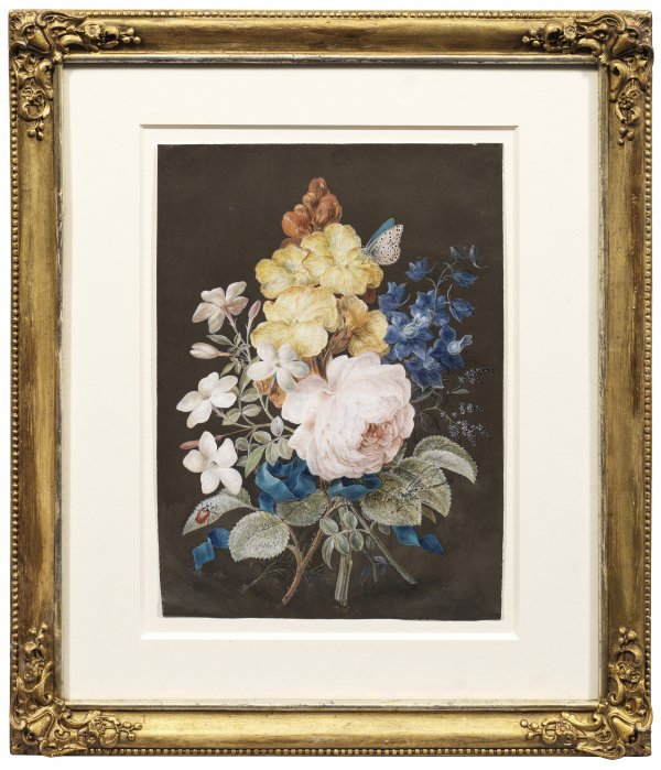 Botanisch getreue, naturnahe Darstellung eines mit einer blauen Schleife zusammengebundenen, kleinen Straußes aus verschiedenen Sommerblumen, auf dessen duftigen Blüten und Blättern ein Bläuling, eine Libelle und ein roter Käfer sitzen. Agricola, der England, die Niederlande und Frankreich bereiste sowie eine Zeitlang in Neapel und Venedig lebte, widmete sich verschiedenen Sujets. Meist in kleinem Format und in Gouachemalerei schuf er er außer von Claude Lorrain und Nicolas Poussin beeinflussten Landschaften nach eingehenden Studien der Natur vor allem Vogeldarstellungen und Blumenstillleben. Gouache/Papier. Verso bez. (von fremder Hand). Ca. 28 cm x 20,5 cm. Rahmen.