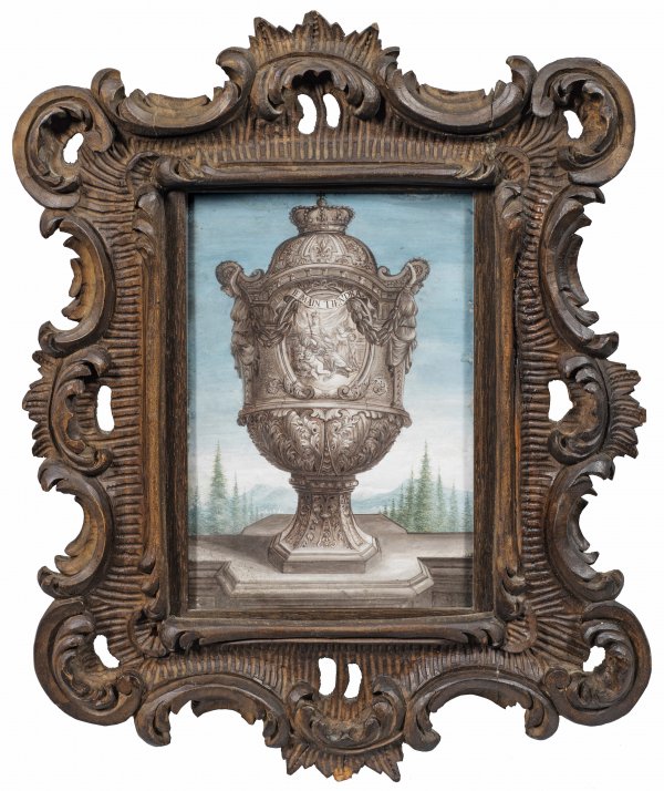 Minutiös geschilderte, reich reliefierte Barock-Prunkvase mit Krone und burgundischer Lilie; schauseitig szenische Darstellung einer Königin mit Engeln, bekröntem Löwen und Reichsapfel sowie einem Schriftband mit Devise "Le MAIN TIENDRA" (Die Hand wird halten) als Allegorie auf die Herrschaft. Gouache oder Tempera/Papier bzw. Pergament. Darstellung ca. 20 cm x 13,5 cm. Aus dem vollen Holz geschnitzter Rahmen mit Rocaillen.
