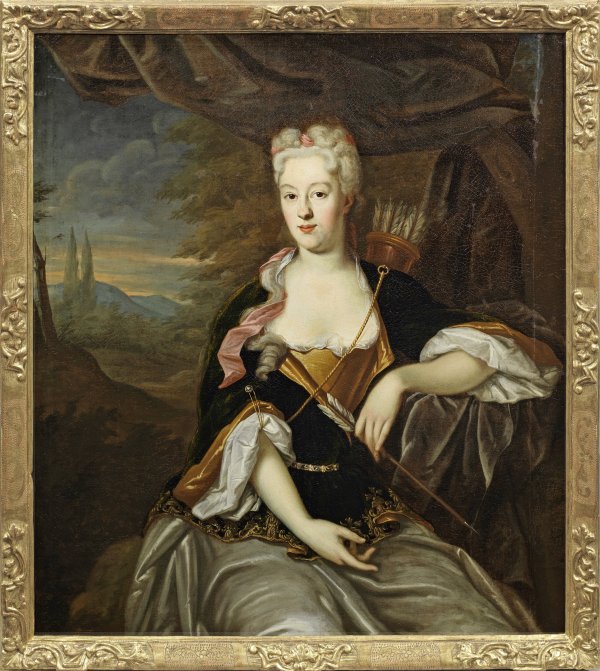 Lebensgroßes, repräsentatives, höfisches Bildnis. Die dominant in den Vordergrund komponierte Adelige mit weiß gepudertem, durch ein rosafarbenes Band geschmücktem Haar, gewandet in ein dunkelgrün-goldenes Jagdkostüm, in der linken Hand einen Pfeil haltend und auf ihrer Schulter einen Pfeilköcher tragend. Durch einen gehobenen Vorhang wird der Blick frei auf einen weiten, abendlich gestimmten Landschaftshintergrund mit Bergen und Zypressen. Die Mode, sich als Diana zu kostümieren und schildern zu lassen, ist charakteristisch für die Epoche des Barock und findet sich bereits auf zahlreichen Bildnissen des niederländischen Hofmalers Johannes Mijtens (um 1614 - 1670). In dieser Tradition steht auch dieses Gemälde, dessen weiterentwickelter Stil jedoch den prägenden Einfluss von Nicolas de Largilličre widerspiegelt, zu dessen Schülern auch Pierre Gobert (1662 - 1744) gehörte. Öl/Lwd., doubl.; 117 cm x 104 cm. Rahmen.