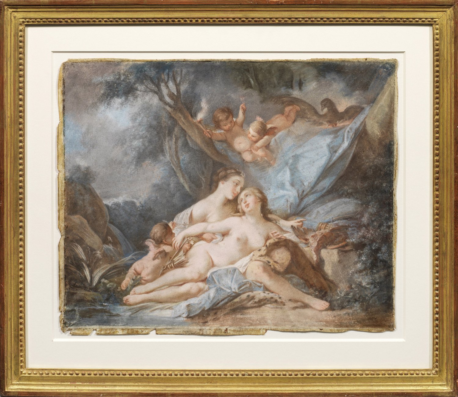 Die in eine Landschaft mit Bach unter Bäumen komponierte Szene zeigt Bouchers Schilderung der sog. "Liebe der Götter", basierend auf Ovids Metamorphosen. Jupiter (rechts oben symbolisch als Adler dargestellt) hat sich in die Göttin Diana (erkennbar an der kleinen Mondsichel auf ihrer Stirn) verwandelt, um Dianas Gespielin Callisto zu verführen. Dieses sapphische Motiv ermöglichte es Boucher, nicht nur einen unbekleiden Körper, sondern gleich zwei leicht weibliche Akte darzustellen. Begleitet wird die erotische Szene von Amor, aus dessen Köcher die sich Diana (Jupiter) hingebende Callisto gerade einen Pfeil zieht, überdies einem neben dem Jupiter-Adler schwebenden Putto- bzw. Amorettenpaar mit brennender Fackel und einem Pfeil. Die Komposition beruht auf dem berühmten Gemälde François Bouchers aus dem Jahr 1759, das sich bis 1777 in der Sammlung von Hippolyte-Louis-Marie Michau de Montblin (um 1730 - 1777) in Paris befand (heute im Nelson-Atkins Museum of Art, Kansas City, Missouri, USA; vgl. Ananoff/Wildenstein, Bd. II, 1976, Nr. 518). Pastell/Papier. Blatt 40,5 cm x 50,5 cm. Rahmen.