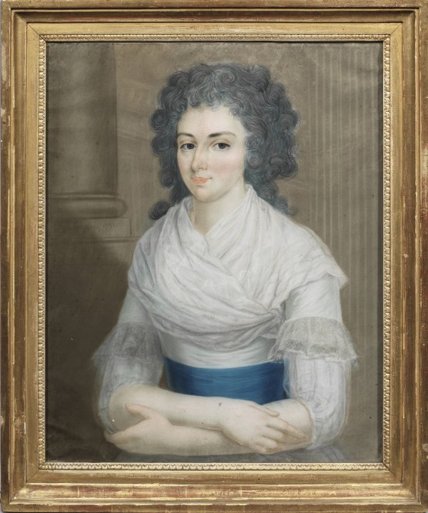 1791 in Paris kurz nach der Revolution entstandenes Werk des gefragten Bildnismalers, der außer in Frankreich u.a. für den russischen Zarenhof in St. Petersburg, in den Niederlanden und in Deutschland (zuletzt um 1806-1808 in Aachen) tätig war. Pastell/Papier. Am linken Bildrand an der Säulenplinthe sign. u. dat. 1791. Ca. 61 cm x 50 cm. Rahmen.
