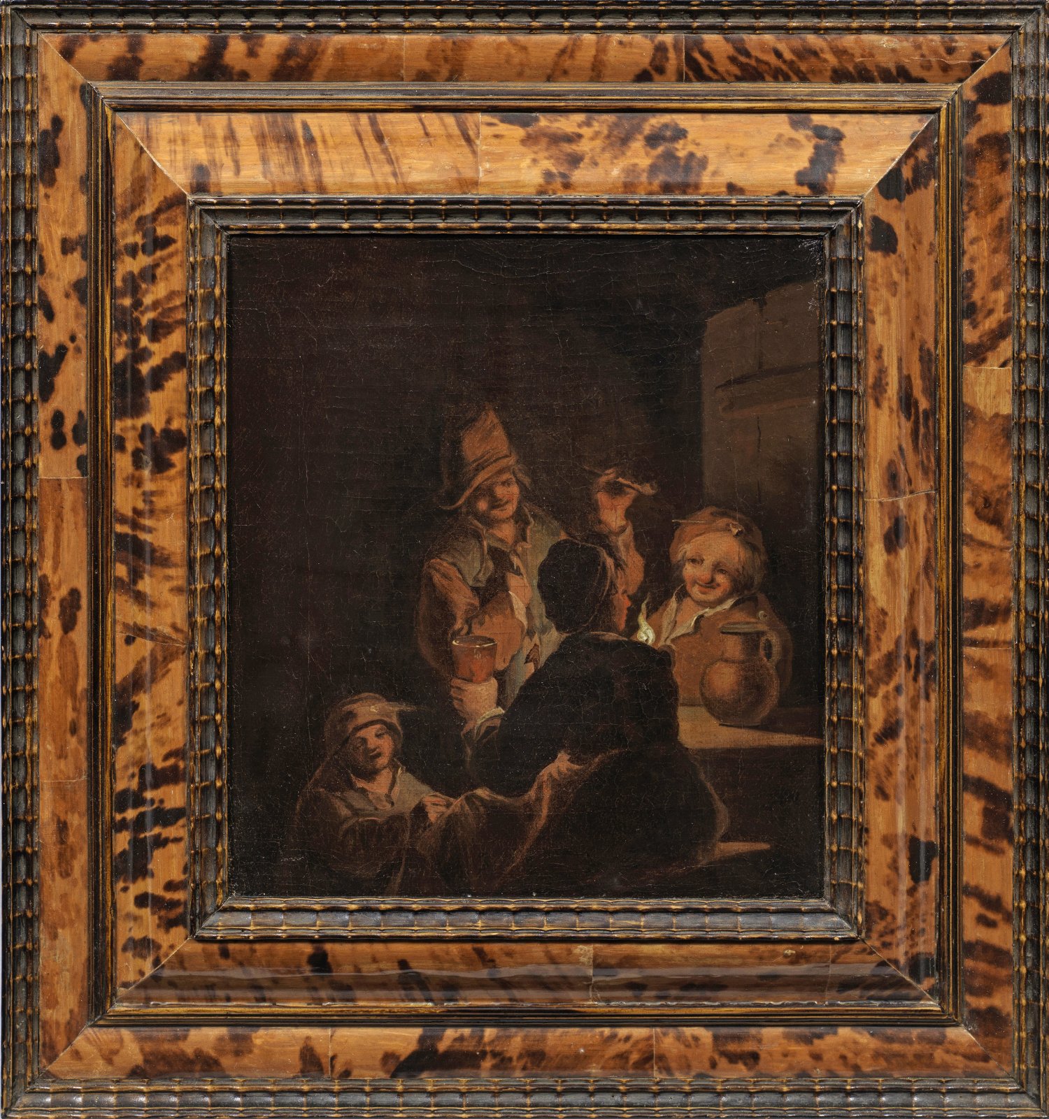 In Motiv und Stil für Trautmann typisches Werk, dessen vielfältiges Oeuvre außer biblischen Motiven, Feuersbrünsten sowie Charakter- und Studienköpfen in der Nachfolge Rembrandts insbesondere Genredarstellungen wie dieses Kabinettbild umfasst. Hierin spiegelt sich der prägende Einfluss der niederländisch-flämischen Malerei des 17. Jhs., Adriaen Brouwers, David Teniers' und Adriaen van Ostades wider. Öl/Lwd.; 21 cm x 19 cm. Rahmen.