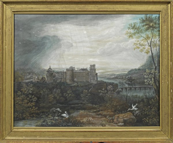 Romantische Darstellung des Schlosses im Gegenlicht mit dem Neckar auf der rechten Bildseite im Vordergrund ein Storchenpaar. Kopie des 19. Jhs. (wohl aus der 1. Hälfte des 19. Jhs.) nach dem bekannten 1812 geschaffenen Gemälde von Wallis (in Privatbesitz). Der bedeutende englische Landschaftsmaler George Augustus Wallis hielt sich 1812-1817 in Heidelberg auf. Gouache/Papier. Verso Klebezettel mit Provenienzangaben. 77 cm x 103 cm. Rahmen.