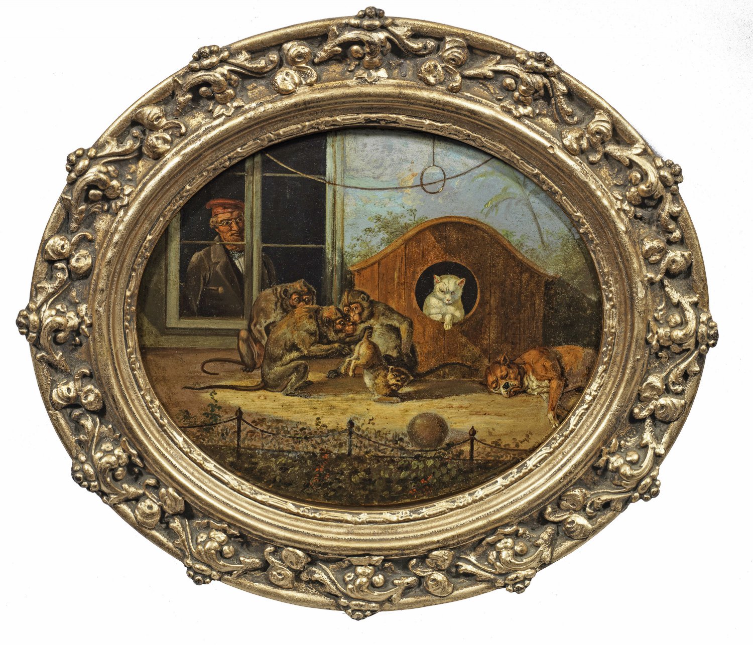 Pittoreske humorvoll-satirische Szene mit drei Affen bei der Untersuchung eines kleines Hundes, den sie am Schwanz hochhalten, während ein großer Hund schlafend am Boden liegt. Beobachtet wird das Treiben von einer Katze in einem Holzhäuschen und einem am Fenster stehenden Gelehrten. In der Tradition der Singerie-Bilder wird in diesem Gemälde in Gestalt der nachahmenden Affen das menschliche Verhalten karikiert. Öl/Holztafel. 27 cm x 33,5 cm, im Oval. Rahmen.