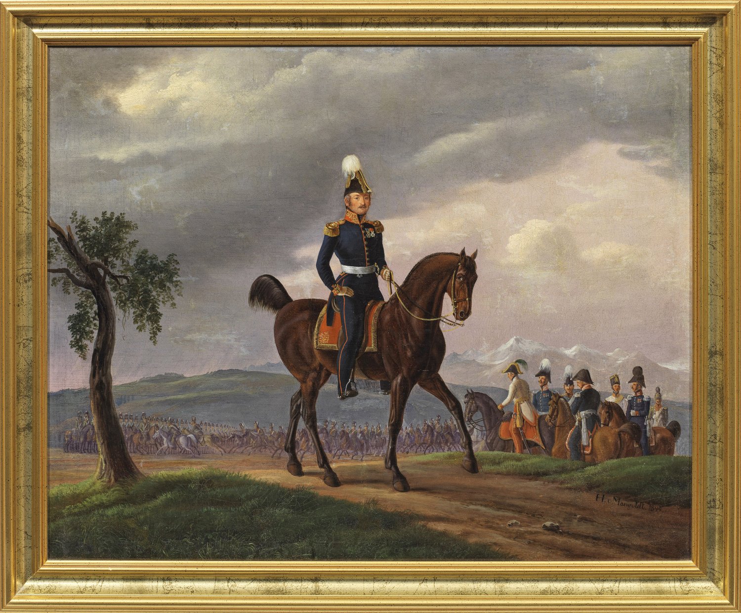Szenische, feinmalerisch ausgeführte Darstellung am 8. Oktober 1843 bei Augsburg vor Alpenkulisse. Auf der rechten Bildseite im Mittelgrund eine Reihe weiterer, namentlich bekannter Offiziere, im Hintergrund Kavallerieeinheiten. Öl/Lwd.; R. u. sign. u. dat. 1844. Verso Ausführliche Angaben zur Darstellung u. Bez. "erhalten im Maerz 1860 vom liebenswürdigen (...) Generalleutnant von Mangoldt (/) Therese von Hausen". 47 cm x 59 cm. Rahmen.