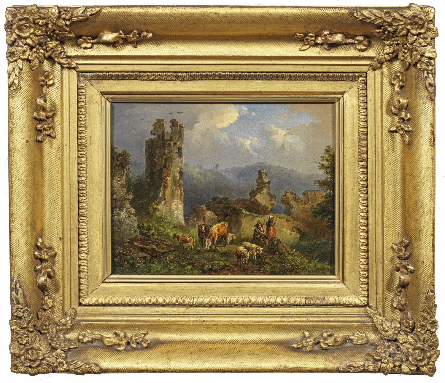 Atmosphärisch gestimmte Landschaft der Romantik. Evers lernte bei Gustav Heinrich Naecke in Dresden und studierte ab Ende 1831 an der Akademie in Dresden. Öl/Eichenholztafel. L. u. Monogr. mit Dat. (18)31. 14 cm x 18 cm. Wohl Original-Rahmen.