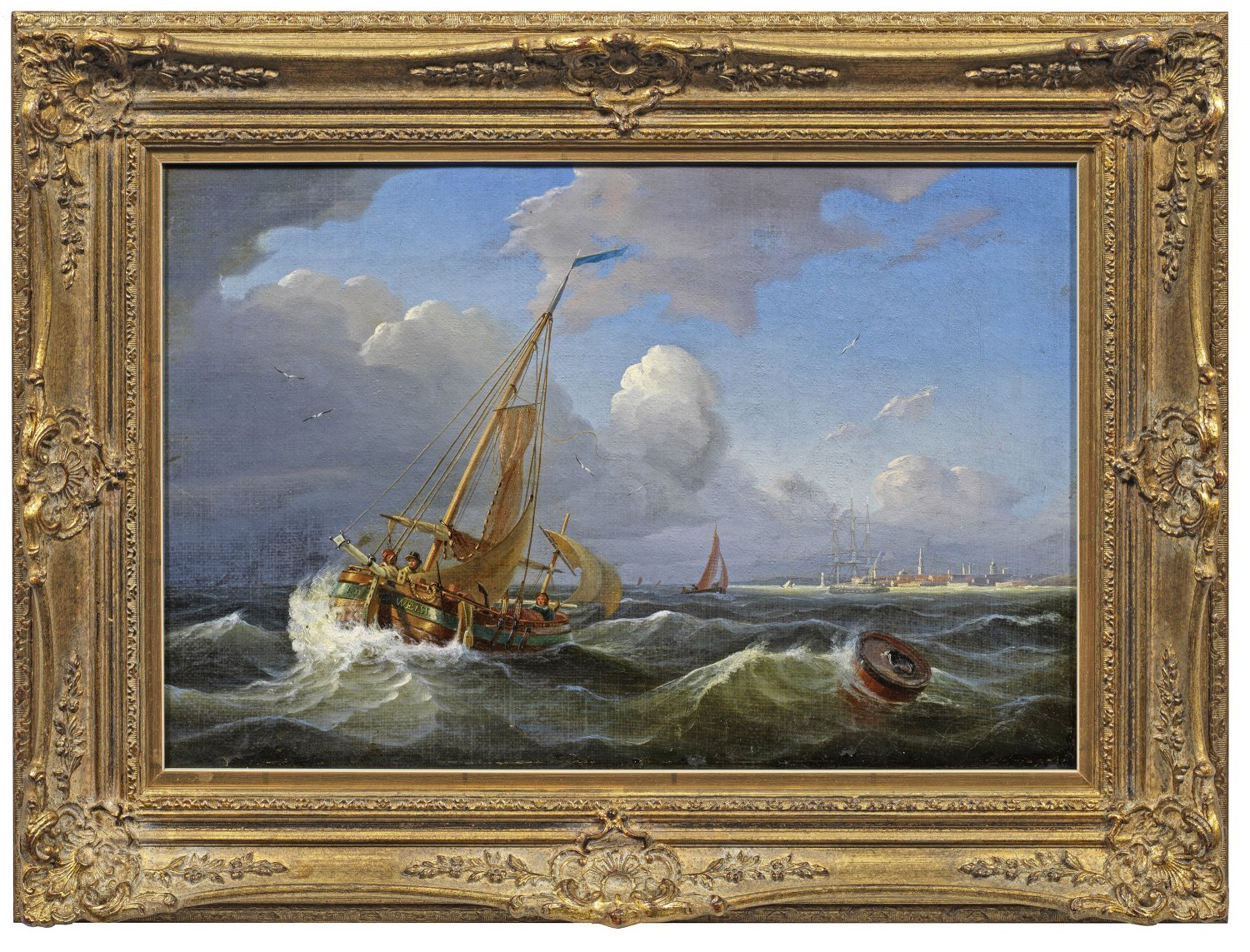 In der Wiedergabe der atmosphärischen Stimmung und des Meeres virtuoses Werk des bekannten Marinemalers. Weiss bereiste die Küsten Hollands, Skandinaviens, Russlands, Englands und Griechenlands. In Zusammenarbeit mit Andreas Achenbach malte er für seinen Gönner Maximilian Herzog von Leuchtenberg eine "Meeresküste mit Leuchtturm". Werke des Künstlers befinden sich u.a. in der Neuen Pinakothek. Öl/Lwd.; Am Bug sign.; 30 cm x 44 cm. Rahmen.