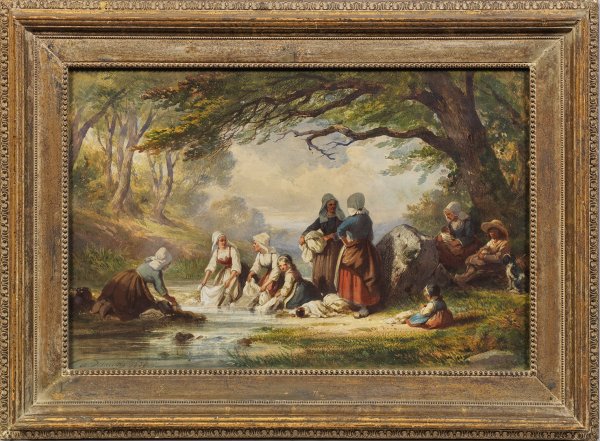 Außergewöhnlich großformatiges künstlerisch herausragendes Aquarell des bedeutenden französischen Genre- Landschafts- Marine- und Orientmalers. Delacroix nahm 1835-1865 regelmäßig am Pariser Salon teil und schuf gleichermaßen Ölgemälde und Aquarelle. Seine bevorzugten Motive waren die Küsten der Bretagne und Nordafrikas in seinen Genrebildern stellte er außer einzelnen Figurenbildnissen ländliche Idyllen und das Leben der Fischer in Nordfrankreich sowie nordafrikanische Alltagsszenen dar. Aquarell u. Gouache. L. u. sign. u. dat. 1850. 41 cm x 62 cm. Rahmen.