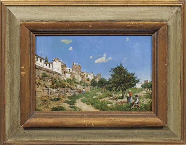 Lichtdurchflutetes frühes atmosphärisch gestimmtes Werk des spanischen Malers der bei Eduardo Cano Manuel Wessel de Guimbarda und Emilio Sanchez Perrier studierte. Mit dem befreundeten Sanchez Perrier wandte er sich um 1885 der Freilichtmalerei zu und malte mit Vorliebe Motive aus Andalusien. International zeigte er seine Gemälde u.a. auf den Weltausstellungen in Paris und Chicago 1889 und 1893 sowie der Internationalen Kunstausstellung in Berlin 1891. Öl/Eichenholztafel. L. u. sign. u. dat. (18)8(?) mit Ortsangabe Sevilla. 27 5 cm x 41 cm. Rahmen.