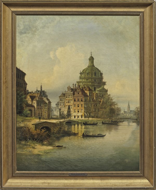 Blick auf eine idealisierte Stadt mit pittoreskem Gebäude-Ensemble, imposantem Kuppelbau und Ruderbooten auf einem Fluss. In einem unverwechselbaren Stil malte Jankowski spätromantische Burgenlandschaften sowie fantasiereiche Motive aus der Wachau, Prag, Venedig und der Schweiz. Öl/Lwd.; L. u. sign.; 52,5 cm x 42 cm. Rahmen.