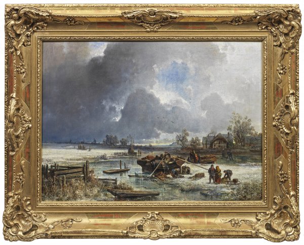 Holländische Winterlandschaft mit Figuren an einem Fischerboot