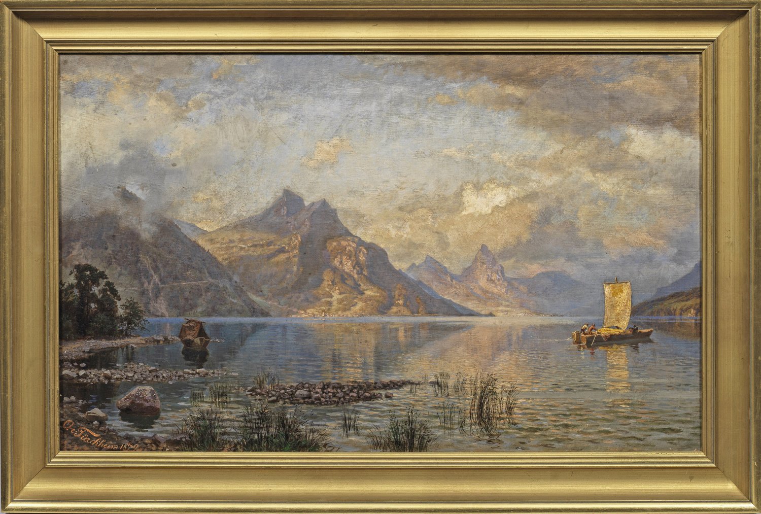 Wohl Blick auf den Vierwaldstätter See in der Schweiz. Mit subtil nunanciertem, teilw. pastelltonigem Kolorit gemaltes, atmosphärisch gestimmtes, seltenes Werk des vor allem als Landschaftsmaler tätigen Künstlers. Öl/Lwd.; L. u. sign. u. dat. 1879. 50 cm x 77 cm. Rahmen.