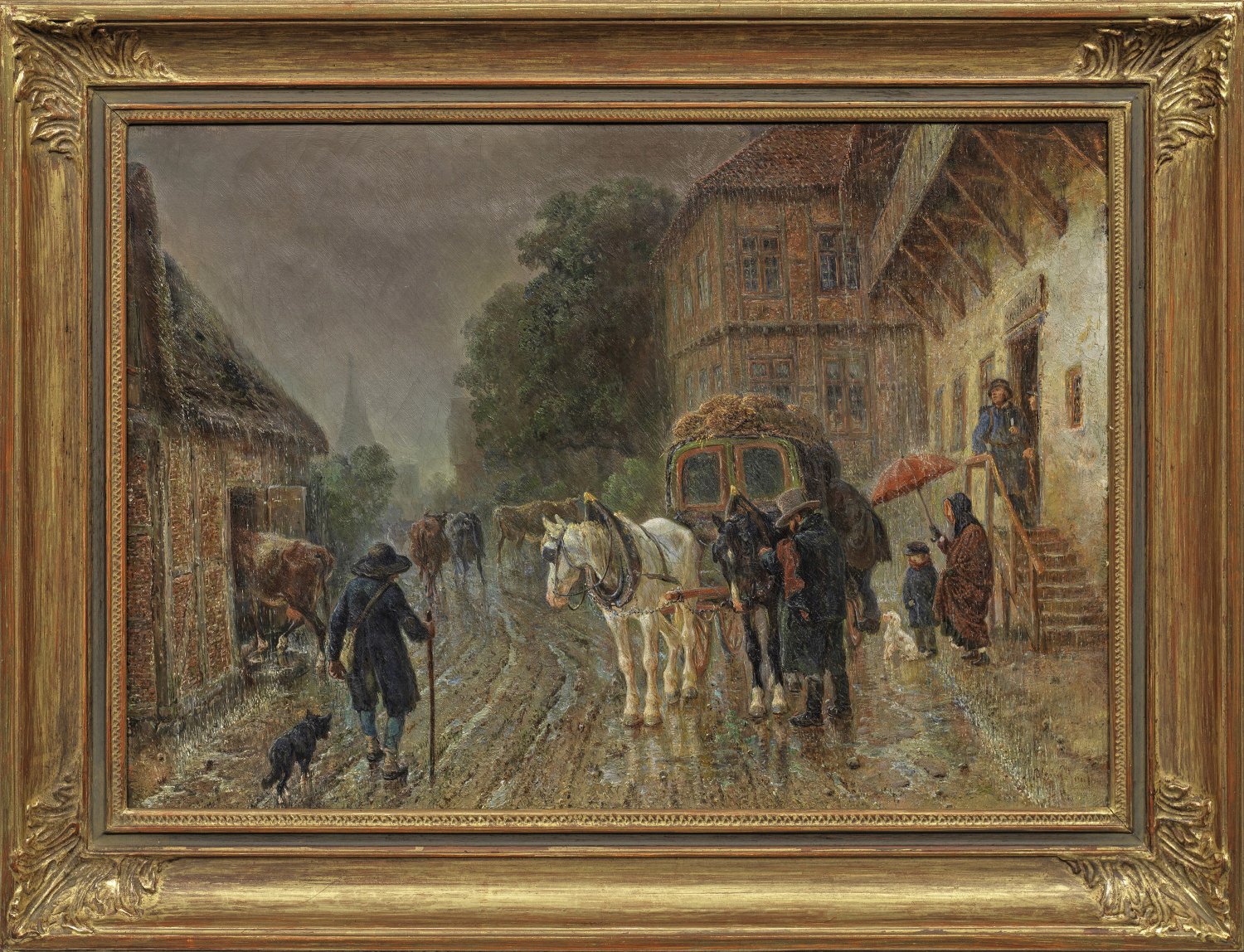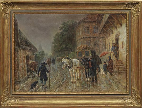 Gemälde mit zugehöriger Zeichnung. Kauffmann schildert eine Szene auf einer durchweichten Dorfstraße vor einem Gasthof "Stadt Kiel", aus dem Reisende kommen, um die im strömenden Regen stehende Kutsche zu besteigen, während der Kutscher das Geschirr des Zweispänners für die Abfahrt richtet. Die linke Bildseite wird von einem Viehhirten dominiert, der versucht, eine Herde von Kühen in einen Stall zu treiben. Das Gemälde gehört mit seiner (wohl später in den 1870er Jahren entstandenen) Zeichnungsversion zu den für Kauffmann charakteristischen, subtil beobachteten, ländlichen Szenen, in denen er verschiedene Pferdefuhrwerke und Kutschen im Schneetreiben und bei Regen schilderte. Öl/Lwd. bzw. Feder/Papier. Jeweils l. u. sign.; 41 cm x 61 cm (Gemälde) bzw. 19 cm x 26,5 cm (Zeichnung). Rahmen.
