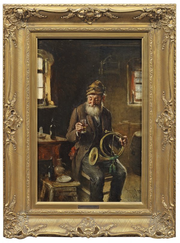 In einer einfachen, ländlichen Stube sitzender, älterer Herr mit abgesetztem Jagdhorn, der auf ein erhobenes Glas schaut. Der Künstler studierte ab 1870 in München bei C. von Piloty, A. von Wagner und F. von Defregger. Ab 1877 in Wien ansässig, machte er sich als Genremaler durch die sympathische Charakterisierung seiner volksnahen Figuren einen Namen. Öl/Holztafel. Verso betitelt. Altes Etikett der Galerie Commeter, Hamburg. Öl/Holztafel. R. u. sign. u. dat. 1905. 47 cm x 30,5 cm. Rahmen.