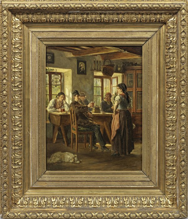 Als Hauptfigur ein der selbstbewusst posierenden Magd zuprostender junger Mann, der einen Bierhumpen emporhält. In der Charakterisierung der Figuren, der Stofflichkeit und der Wiedergabe des einfallenden Lichts subtil ausgeführtes, erzählerisches Genrebild des Künstlers. Klaus studierte 1869-1878 an der Münchener Akademie u. a. bei W. Lindenschmit und beschickte öfters die bedeutenden Ausstellungen in Deutschland und Wien. Öl/Holztafel. R. u. sign.; 43 cm x 34 cm. Rahmen.