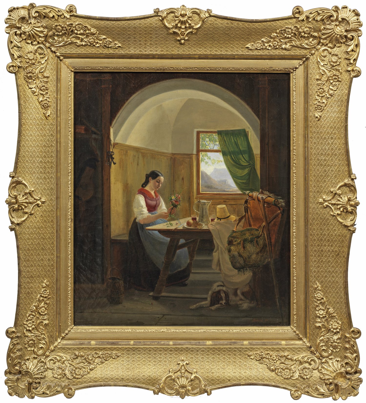 Fein lasierend ausgeführtes Genrebild, das aufgrund des idyllischen Motivs und des Stils dem frühen Oeuvre Schorns zuzuordnen ist. Der an der Münchener Akademie ausgebildete Maler wandte sich später orientalischen Motiven zu und ging Ende des 19. Jhs. nach Ahrenshoop, wo er sich der Künstlerkolonie um Paul Muller-Kaempff anschloss und die dortigen norddeutschen Landschaften zu seinem Hauptsujet wurden. Öl/Lwd.; R. u. sign.; 51 cm x 44 cm. Rahmen.