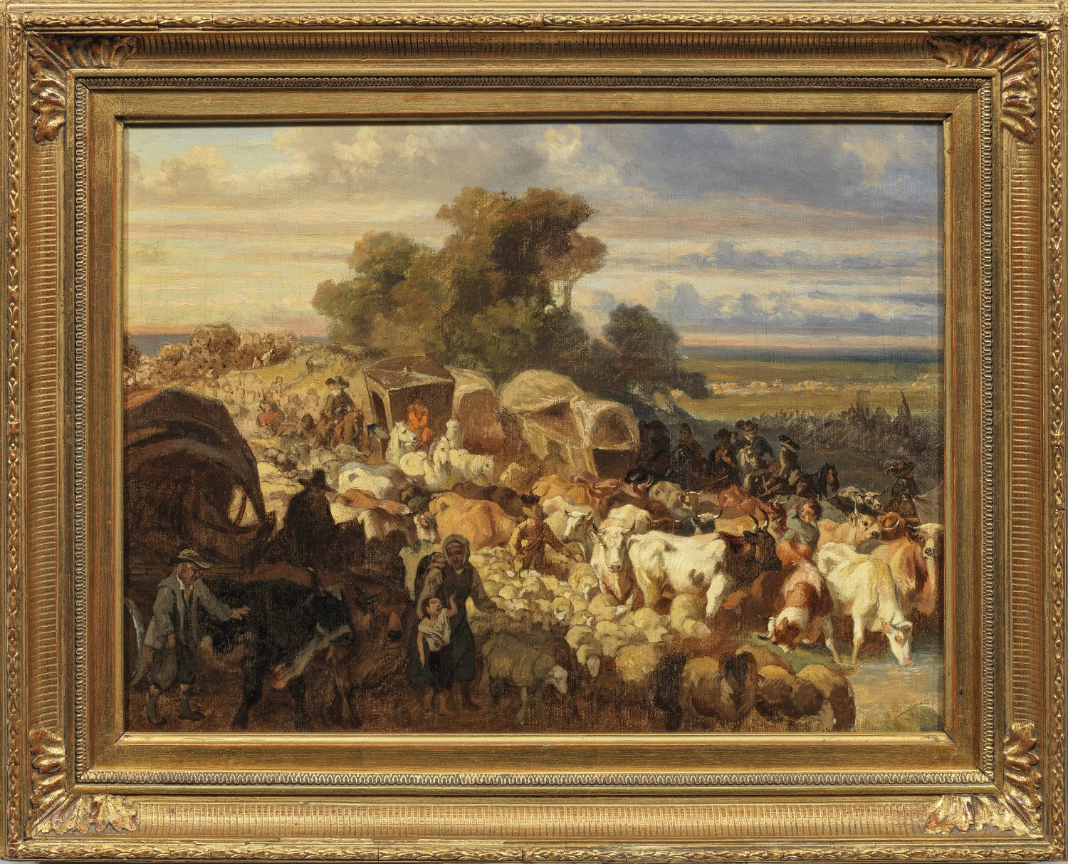 Mit weichem Duktus gemalte, in eine weite, hügelige Landschaft komponierte Szene aus der Epoche des Barock, die einen vielfigurigen, langen Treck mit Kutschen, Planwagen, Reitern, Rinder- und Schafherden schildert, links im Vordergrund eine Mutter mit Kind und ein Bauer, der zwei Rinder antreibt. Durch eine geschickt eingesetzte Licht- und Farbperspektive verstärkte der Maler die tiefenräumliche Komposition. Dargestellt ist wohl die Flucht der Hugenotten aus Frankreich Ende des 17. Jhs. oder eine der Protestantenvertreibungen aus Österreich im 17./18. Jh.; Öl/Lwd., doubl.; 38 cm x 50,5 cm. Rahmen.