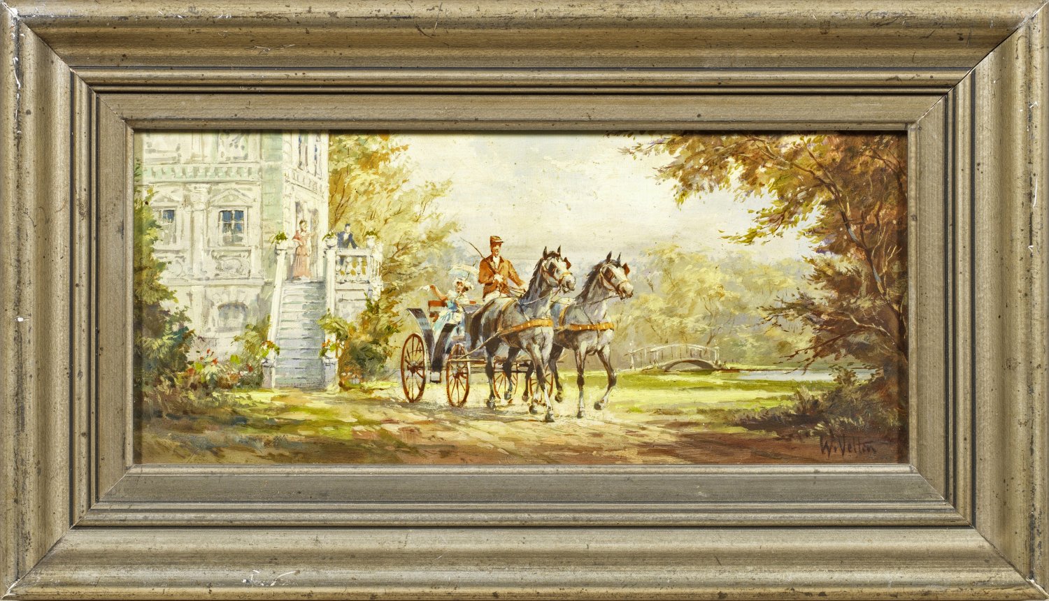 Stimmungsvolles Werk des an den Petersburger und Münchener Akademien u. a. bei Wilhelm Diez ausgebildeten Künstlers. Velten schilderte mit Vorliebe historisierende Darstellungen mit Reitern und Kutschen aus der Barock- und Rokoko-Zeit. Öl/Holztafel. R. u. sign.; 15,8 cm x 21,8 cm. Rahmen.
