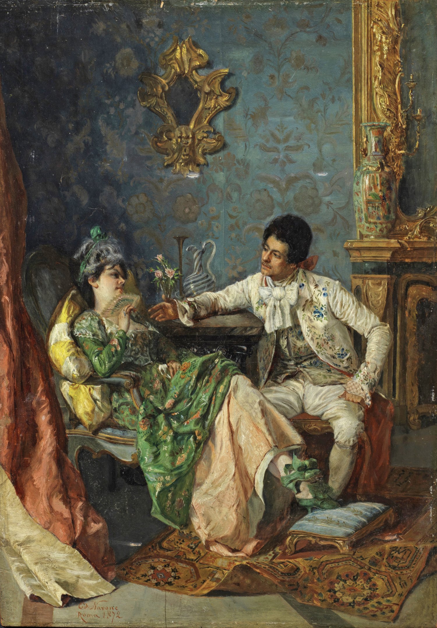 Erzählerisch in seiner Stofflichkeit und Schilderung des amourösen Themas virtuos geschildertes Genrebild Navones dessen galante höfische Szenen in einem realistischen Stil zu den besten Gemälden seines Oeuvres zählen. Navone der an der Akademie studierte stellte ab 1871 vielfach national und international aus. Öl/Holztafel. L. u. sign. u. dat. 1872 mit Ortsangabe Rom (Roma). 41 5 cm x 29 5 cm.
