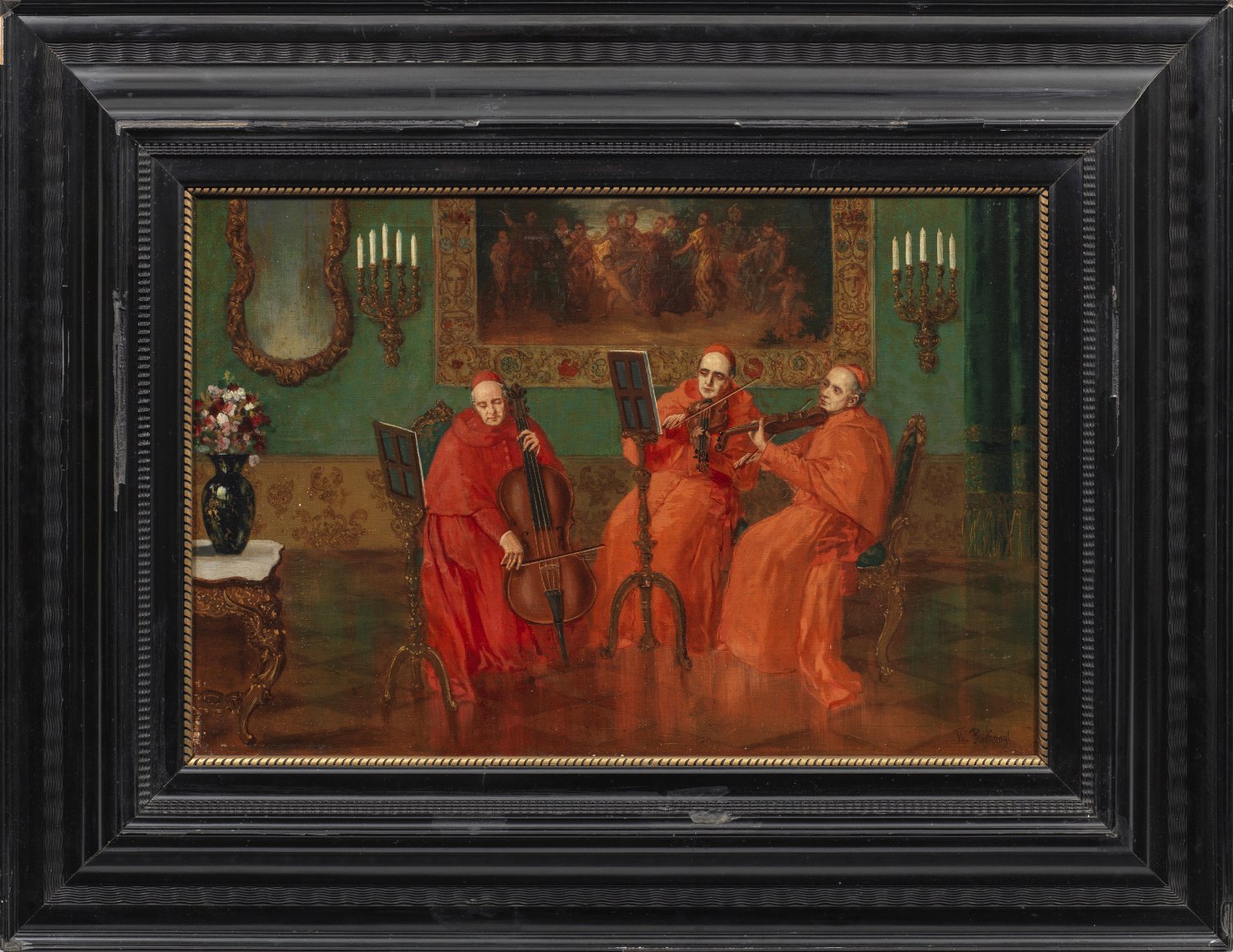 Der ab 1881 an der Akademie ausgebildete Künstler widmete sich vornehmlich der Genre- und Porträtmalerei, wobei er mehrfach Kardinäle schilderte. Um 1900 gehörte er zu den international bekannten Malern, dessen Werke bis nach London und New York verkauft und auch als populäre Kunstpostkarten publiziert wurden. Öl/Lwd.; R. u. sign.; 40 cm x 60 cm. Rahmen.