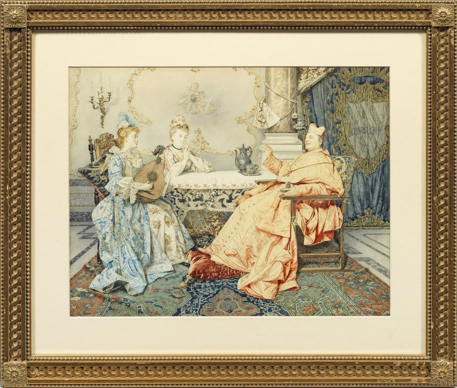Feinmalerisch ausgeführte Genreszene mit meisterhafter Stofflichkeit und Figurencharakterisierung. Der bedeutende Genre- und Orientmaler der in Rom bei Aurelio Tiratelli studierte widmete sich früh der Aquarellmalerei durch die er international zu einem hoch geschätzten Künstler wurde. Ab 1899 stellte er regelmäßig im Pariser Salon aus 1900 auf der Weltausstellung. Aquarell/Papier. R. u. sign. u. dat. 1896 mit Ortsangabe Paris. Ca. 37 8 cm x 47 8 cm. Rahmen.
