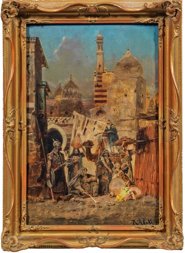 Pittoreske Szene aus Desouk in Ägypten mit einem Krieger, einem Reiter auf einem Kamel und mehreren weiteren Figuren vor dem Hintergrund zweier Moscheen. Alott studierte 1868-1873 an der Kunstakademie in Wien, anschließend ging er nach Düsseldorf, wo er von Oswald Achenbachs Landschaftsmalerei geprägt wurde. Außer Österreich und Italien bereiste er auch Nordafrika, insbesondere Tunesien und Ägypten. Seine Landschaften und Veduten verband er hierbei oft mit Genremotiven und Szenen aus dem Volksleben. Öl/Holztafel. R. u. sign. u. undeutl. dat.; Verso auf altem Etikett betitelt. 39 cm x 26,5 cm. Rahmen.