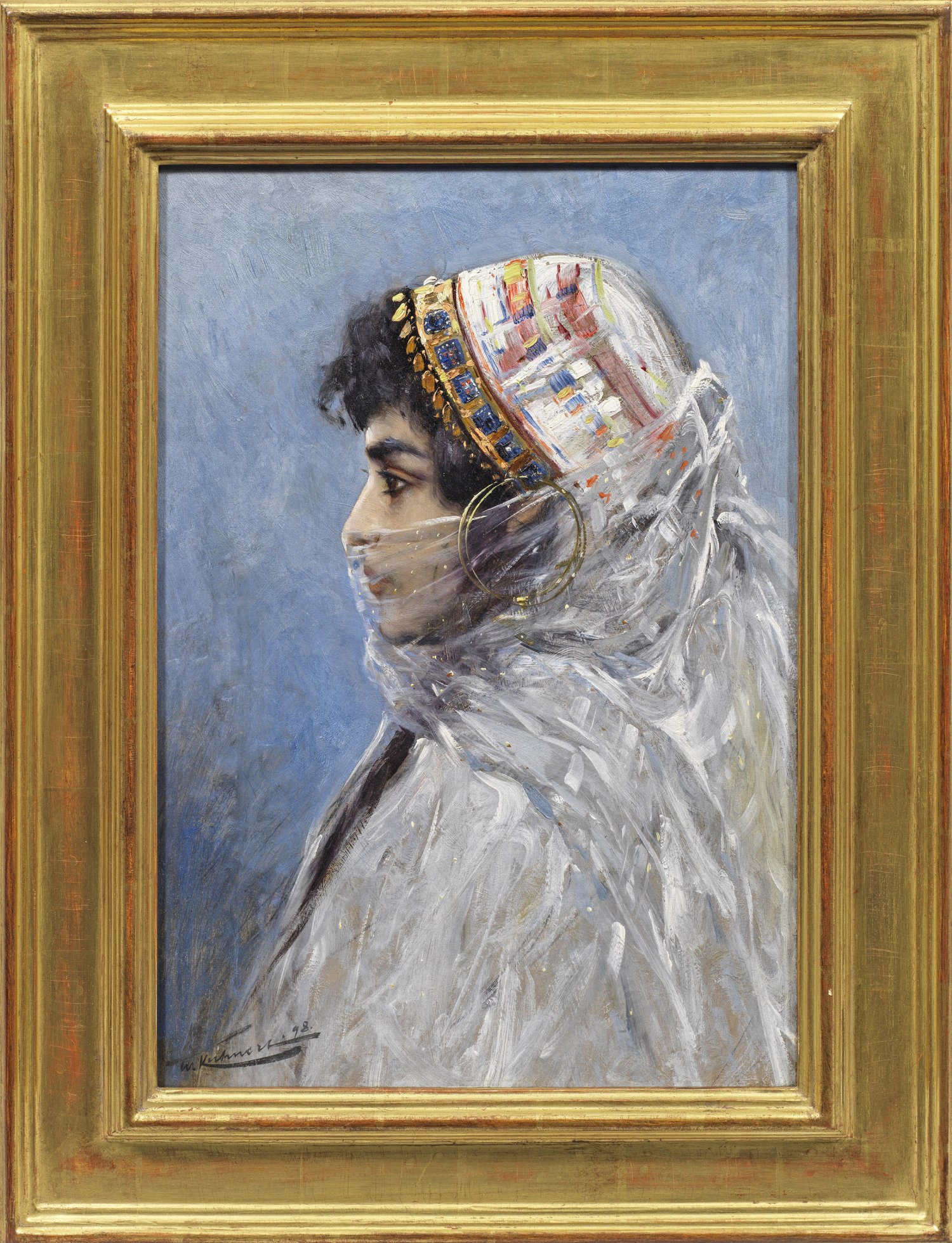Seltenes realistisches wohl in Ägypten oder dem Sudan entstandenes Bildnis Kuhnerts der vor allem durch seine Tierbilder bekannt wurde und das Bild von Afrika und seiner Tierwelt in Europa und den USA prägte. Kuhnert studierte 1883-1887 als Stipendiat an der Königlichen Akademischen Hochschule für Bildende Künste in Berlin. Von seinem Wohnsitz in Berlin aus unternahm er Reisen nach Ägypten in den Sudan nach Ostafrika Ceylon und Indien um Landschafts- und Tierstudien vorzunehmen. Prägend für Kuhnerts Oeuvre waren vor allem seine Reisen nach Afrika 1891/92 und 1905/06 wo er die Motive für seine Gemälde fand die ihn zu einem der bedeutendsten Tiermaler der Kunstgeschichte werden ließen. 1893 erhielt Kuhnert auf der Grossen Kunstausstellung in Berlin eine Ehrenmedaille 1904 auf der Weltausstellung in St. Louis eine Goldmedaille. Porträts figürliche Szenen und das Bildnis des Menschen spielen in seinem Werk eine untergeordnete Rolle doch spiegeln die wenigen bekannten Bildnisse seine außerordentliche Begabung auch auf diesem Gebiet wider. Öl/Malkarton. L. u. sign. u. dat. (18)98. 43 cm x 31 cm. Rahmen.