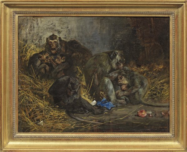 Höchst lebendig geschildertes, in Motiv und Stil charakteristisches Tierstück des Künstlers, der die eingehend studierten Affen bei ihren verschiedenen Beschäftigungen wie dem Lausen zeigt. Der aus einer Künstlerfamilie stammende Maler lernte bei seinem Vater Friedrich Eduard Meyerheim und studierte 1857-1860 an der Akademie. Ab 1883 leitete er die Tiermalerklasse an der Akademie, ab 1887 als Professor. Die virtuose Darstellung exotischer Tiere, besonders Löwen und Affen, wurde seine Spezialität. Meyerheim gehört daher auch zu den Illustratoren von Brehms Tierleben, wofür er u. a. Schimpansen zeichnete. Neben realistischen Darstellungen wie auf diesem Gemälde malte er überdies eine Reihe humoristischer und satirischer Szenen mit Affen, vergleichbar mit denen seines Malerkollegen Gabriel von Max (1840 - 1915). Öl/Lwd.; R. u. sign.; 36,5 cm x 48 cm. Rahmen.